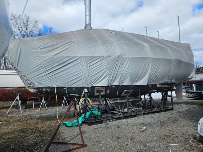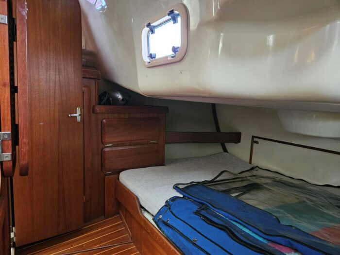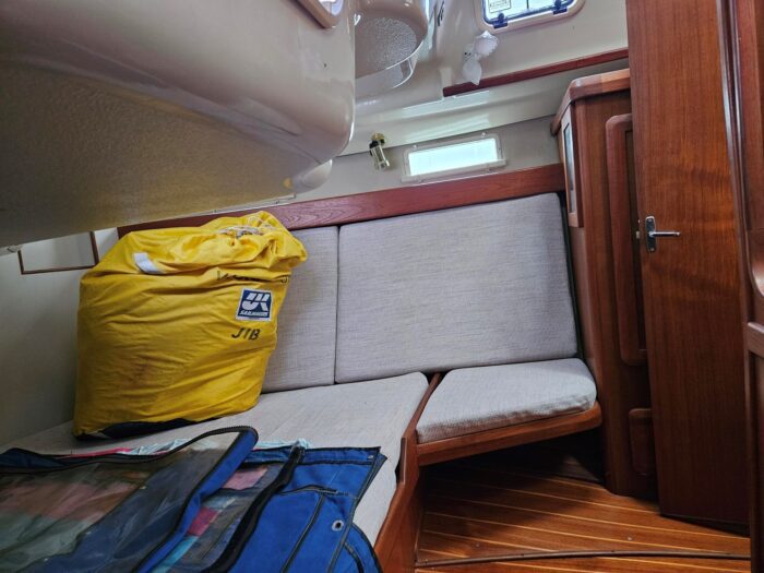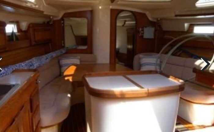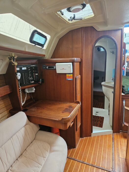 Her sail inventory includes a full batten mainsail, furling jib, spinnaker, and lazy jacks. Sail handling is made easier with Barient cabin winches, including a power cabin winch.