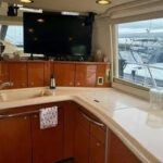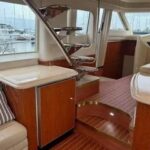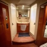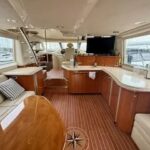 A few steps down from the salon, the fully equipped galley features solid-surface countertops, full-size appliances, and ample storage — ideal for preparing meals for a crowd or a quiet dinner for two. The open-concept layout ensures that the galley remains connected to the main living space, creating a warm, social environment throughout the main deck.
