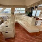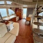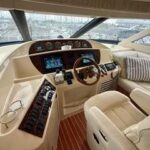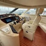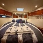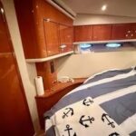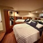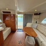 Inside, the yacht reveals a spacious and luxurious interior, finished in high-gloss cherry wood and outfitted with premium fabrics and materials throughout. The main salon is open and bright, with large side windows allowing in natural light and providing sweeping views of your surroundings. Plush seating invites relaxation, and a well-integrated entertainment center ensures you’re never far from comfort or convenience.