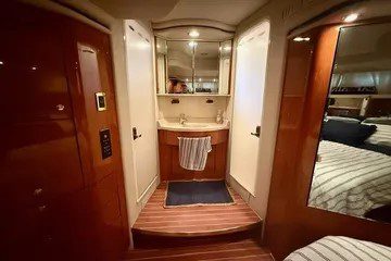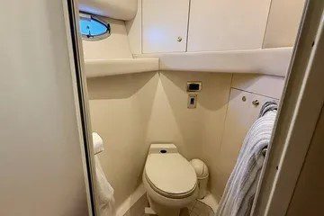 Below, the Sea Ray 540 offers a three-stateroom, two-head layout that easily accommodates six overnight guests. The full-beam master stateroom is located aft, separated from the other cabins for maximum privacy. It includes an en suite head, generous closet space, and in many models, a washer/dryer unit for added convenience. Forward, the VIP stateroom features a centerline queen berth and elegant cabinetry, while the third stateroom offers versatile sleeping arrangements for guests or crew.