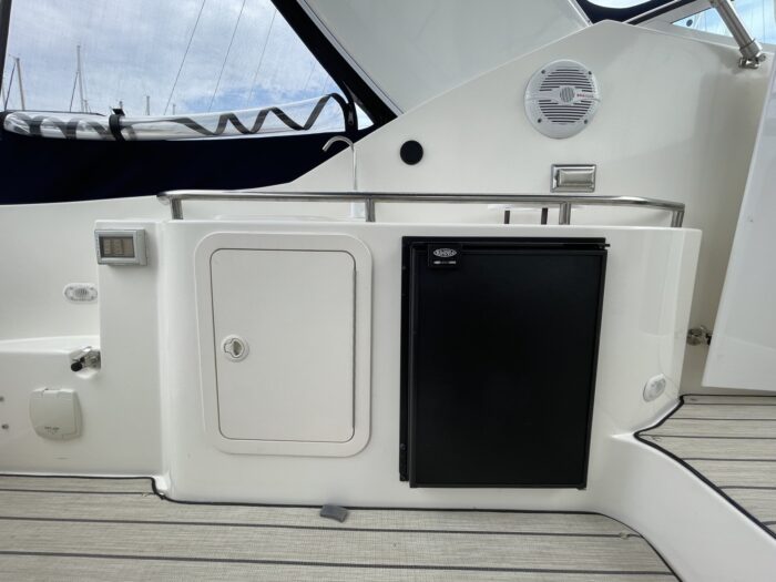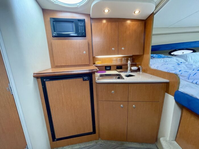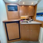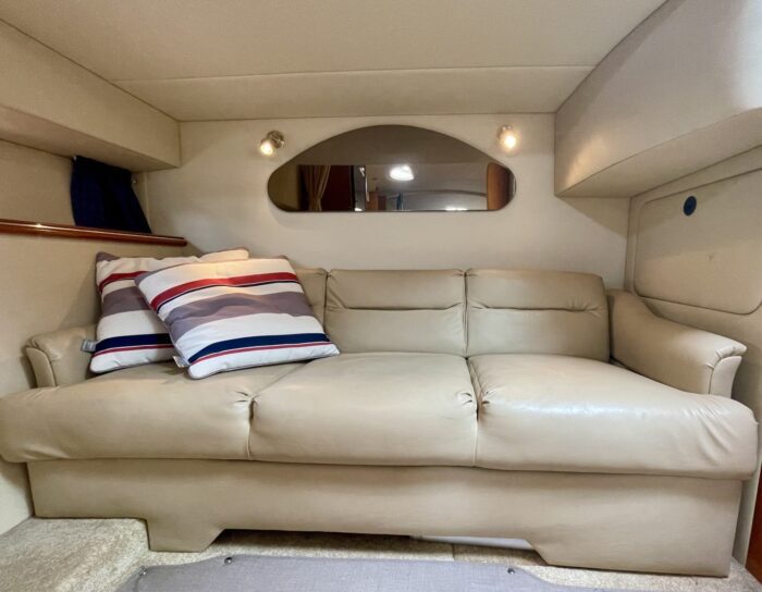 A fully equipped galley, located to port, offers all the necessary amenities, such as an electric stove, large refrigerator and microwave oven. Across from the galley lies a crescent-shaped dinette, which can be converted into a berth for extra overnight guests. The aft settee also easily converts to a double berth, and a privacy curtain offers an extra measure of convenience.