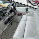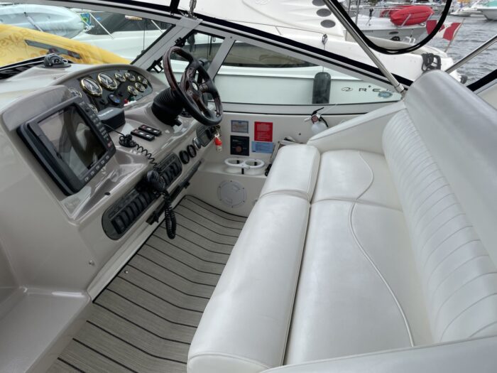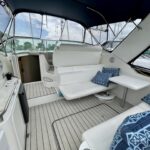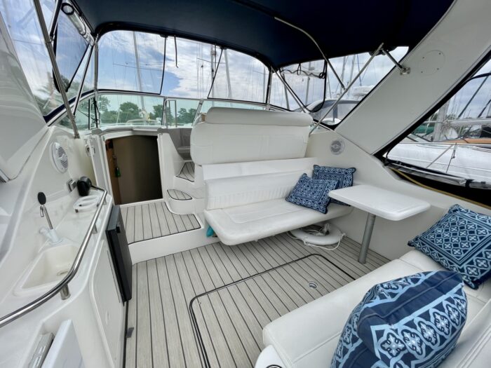 Above deck, the Cruisers 320 Express features a triple-wide helm seat for maximum cruising comfort as well as a walk-through windshield allowing for easy fore deck access. What’s more, a fully concealed anchor locker eliminates the toe-stubbing often associated with foredeck chores. Further aft, she offers fore- and aft-facing cockpit seating and a twin convertible cockpit table/sun lounge, perfect for catching afternoon rays.