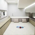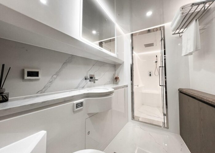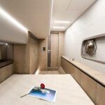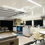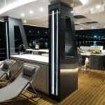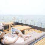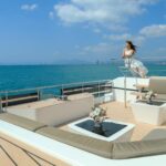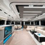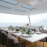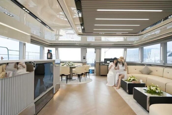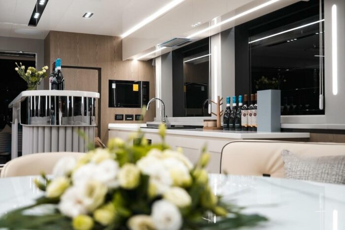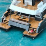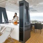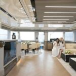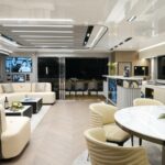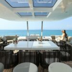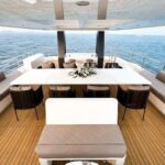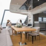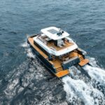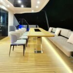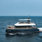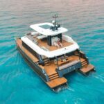 A chic yet robust tomahawk silhouette and a steadfast vertical bow, the EF56 catamaran cruises majestically across the water, accentuated by its grand elongated portholes. It elevates luxury through its innovative spatial design.